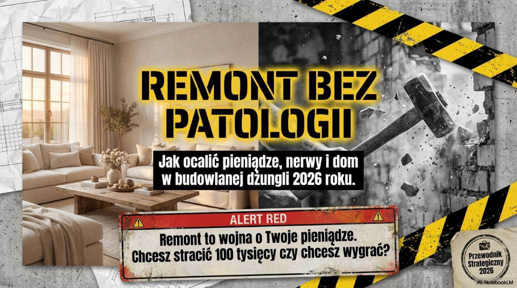 📄 E-book PDF — „Remont bez patologii” (Jan Czajka) Pełny poradnik, ponad 60 stron, 10 rozdziałów. Brutalny cennik 2026, zasada B-F-W, system płatności etapami, katalog katastrof i bezwzględna lista kontrolna odbioru — 120 punktów. Czytasz przed remontem, wracasz do rozdziałów w trakcie.